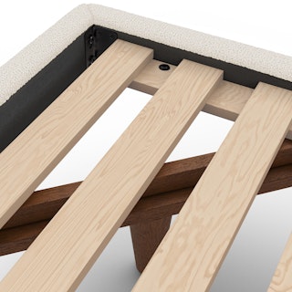 - Upholstered in a soft, non-absorptive bouclé fabric. Bouclé is an excellent choice for those who want an easy-to-care-for, style-forward bed