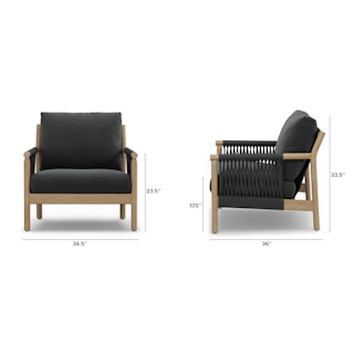 - Loose seat and back cushions upholstered in a UV and water-resistant Olefin fabric