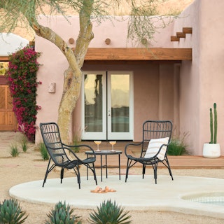 Inspired by rattan furniture popular in the 50s and 60s, this modernized chair is handcrafted using traditional weaving techniques with new and improved materials. Woven from a more durable, technically advanced synthetic wicker, the Medan chair is a great indoor/outdoor furniture option and withstands fluctuating temperatures without cracking, splintering, or corroding. A deep, embracing seat welcomes you to lounge on the patio for hours. Pair with one of our sheepskin throws for an added luxurious experience.