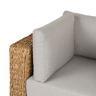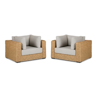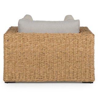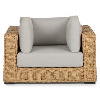 Inviting by nature, the twisted weave of this faux banana leaf wicker lounge chair evokes a coastal calm worthy of all day (or all night) lounging. The Capra chair features a sturdy aluminum base and is generously topped with multiple weather-resistant pillows and a cushion fit for private island-style relaxation.