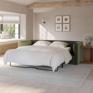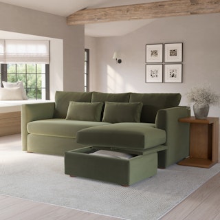 How do you want your sofa to feel? Elevated, comfortable, calm, and collected. With clean details and pleasing design heft, the Marina reversible sleeper storage sectional manages to feel at once laid-back and put together. Generously padded seats and armrests encourage long periods of meandering; grab the sheets from the hidden storage and fold out that memory foam mattress for a more serious nap. Upholstered with Hale velvet, the Marina is fade-resistant, easy to clean, and anti-crush. Throw on your favorite 90s romcom and bask in a little nostalgia.